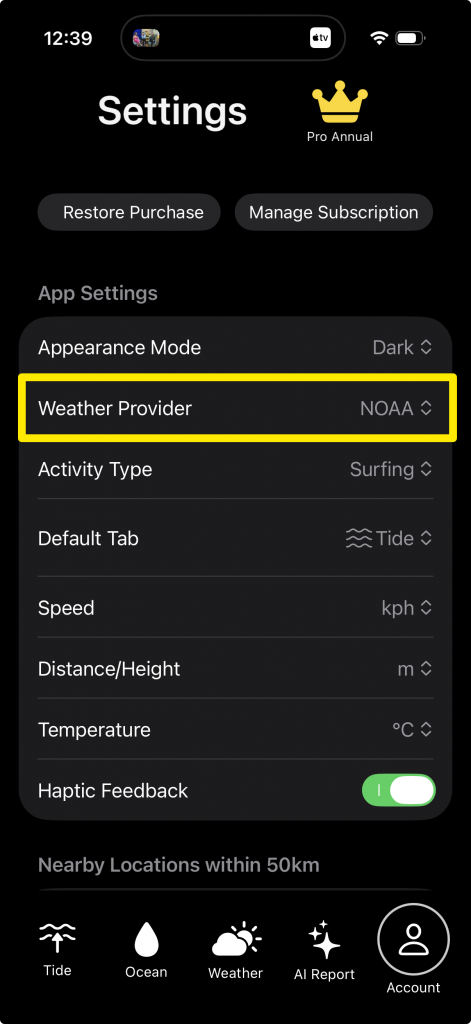 - Navigate between screens using the tab icons at the bottom of the screen to view Tides, Ocean Conditions, Weather, and AI Surf Reports
